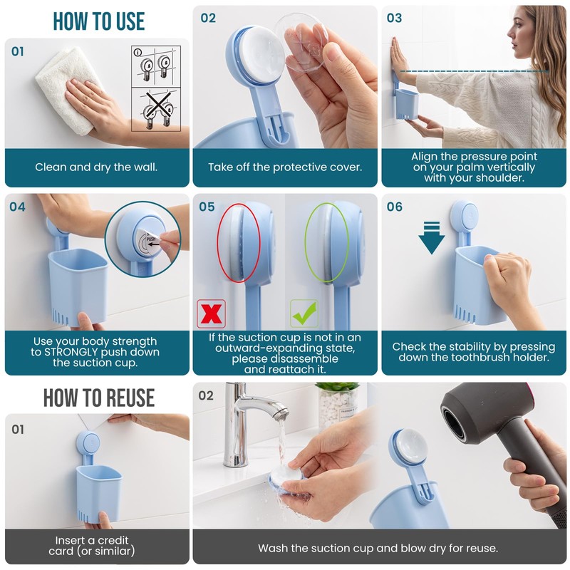 - Removable and reusable: The suction cup toothbrush holder is easy to remove and re-install in a new surfaces for reusing. Just use a credit card to remove the suction cup and wash it with warm water before re-installation. Our unique vacuum suction cups holder is ideal for condominiums and rentals