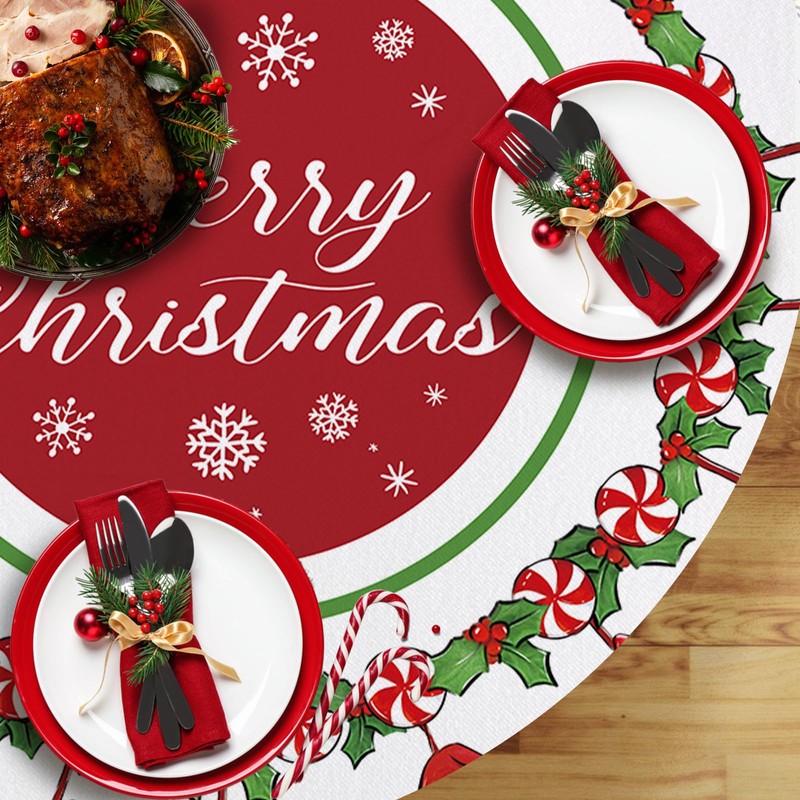 - Unique Stylish Design: The Christmas themed tablecloths were printed with cute gingerbread man, holly red berries, lollipops, candy cane, snowflakes patterns. The unique design makes our table cloths eye-catching no matter in the home or at the party. Choose our round table cover to decorate your home and create your own style. Not only is it a perfect way to protect and decorate your table, but it also brings you a deeply cheerful festive atmosphere