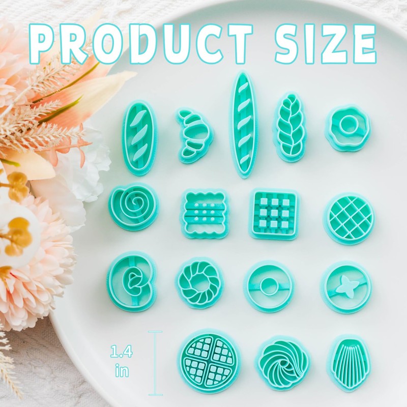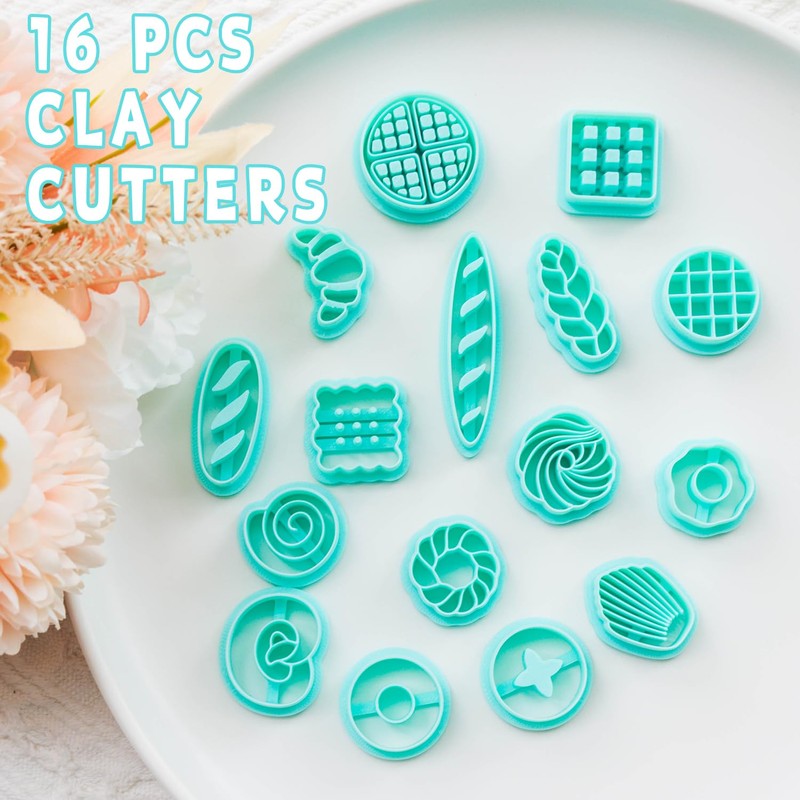 - 【Bread Clay Cutters】16 shapes clay cutters: pineapple bun clay cutters, soda cracker clay cutters, baguette clay cutters, pretzel clay cutters, croissant clay cutters, twist circle bread clay cutters,hot cross bun clay cutters,doughnut clay cutters,cinnamon roll clay cutters,braided bread clay cutters,madeleine clay cutters,waffle clay cutters,cruller clay cutters