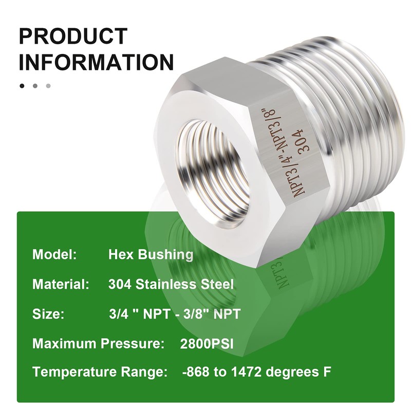 - Product Type —— Reducer Hex Bushing(3/4"Male NPT x 3/8"Female NPT) with protective case,for industry connecting pipes or fittings with different end types,diameters,or materials,NPT thread size does not actual diameter,it is only nominal pipe size.
