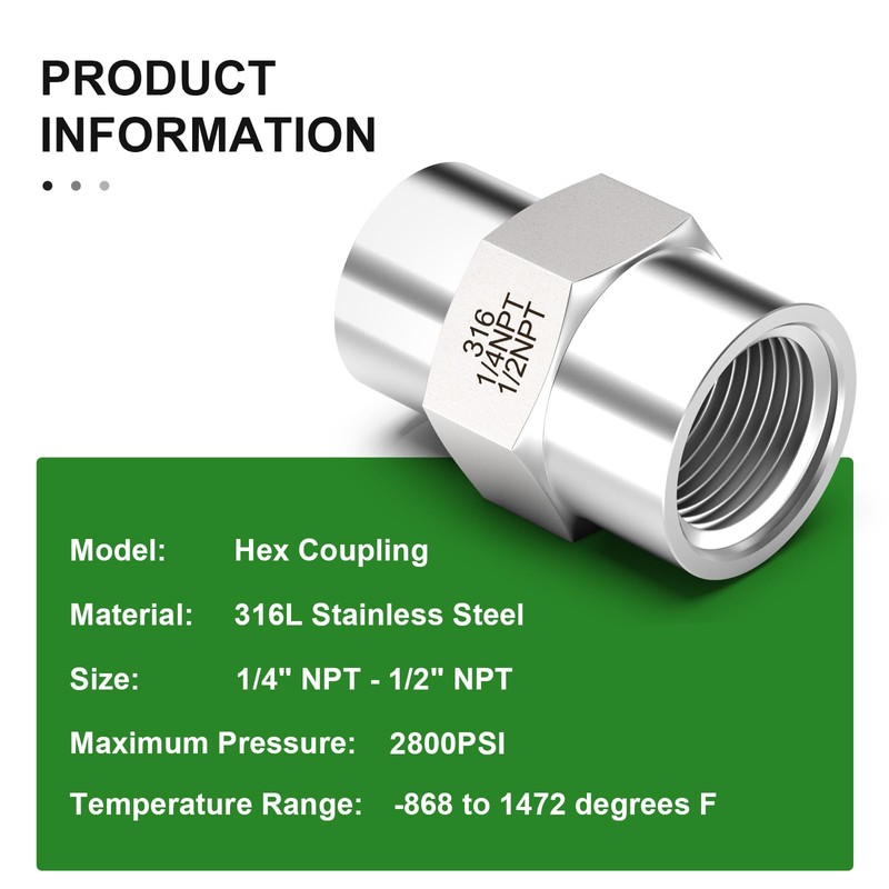 - Product Type —— Reducer Coupling(1/2" NPT Female x 1/4" NPT Female),for industry connecting pipes or fittings with different end types,diameters,or materials.