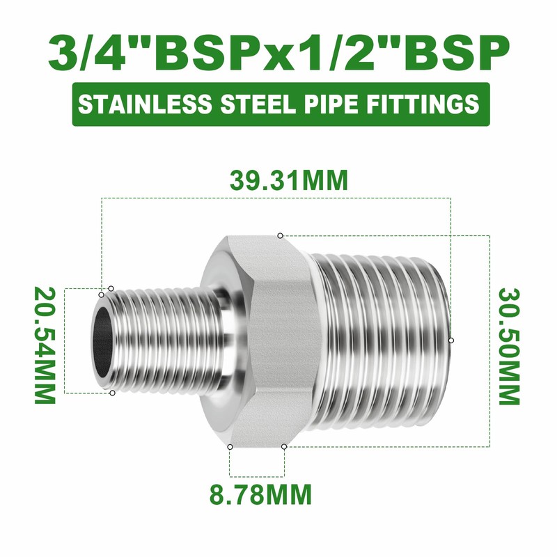 - [ Product Type ] Hex Nipple(3/4"Male BSPx 1/2"Male BSP), for industry connecting pipes or fittings with different end types, diameters, or materials.