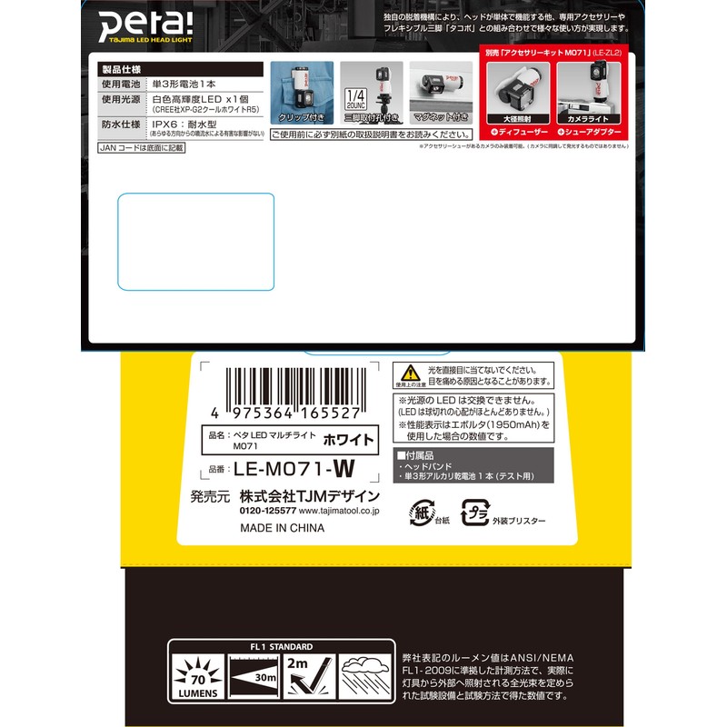 Tajima LE-M071-W Peta LED Multi Light M071-W White Brightness Up to 70 lm (24 h Illumination at 5 lm)