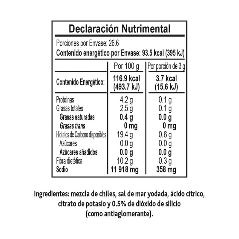 | Ingredientes | Mezlca de chiles, sal de mar yodada, ácido cítrico, citrato de potasio y 0.5% de dióxido de silicio |