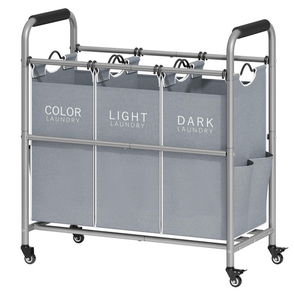 Tajsoon 3 Bag Laundry Sorter Cart, Laundry Hamper Sorter Basket with Heavy Duty Lockable Rolling Wheels for Clothes Storage, Grey & White