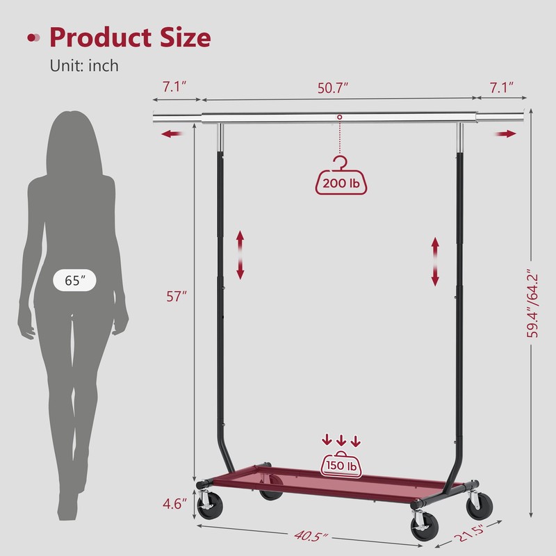 - 【Adjustable Clothing Rack】The horizontal rod extends from 50.6" to 64.9", and the vertical height can be adjusted from 59.4" to 64.2", which can accommodate both short and long garments. You can adjust the length and height of the rod to meet your space needs.