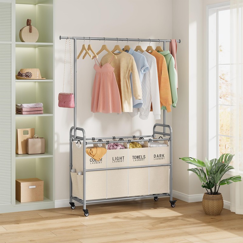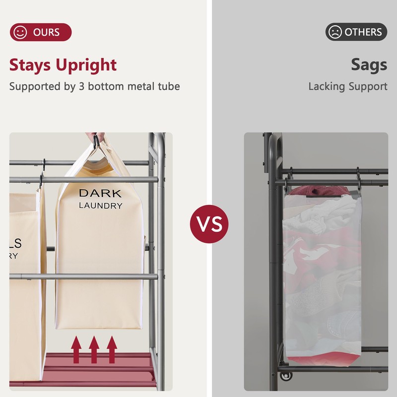 - 【2-in-1 Design】Our laundry sorter with hanging rack adds new organizing options compared to other laundry carts. Sturdy hanging rod to hang clothes or steam, retractable side rods provide extra storage space for bags or scarves.