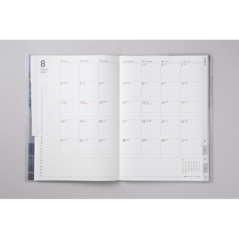 - [Product detail 2] Cover type: clear cover; Imprint color: 3 colors; Number of pages: 128 pages; Specifications: Pen holder, monthly index; Supplements: age chart, telephone list, cut memo, grid note, subway route map, Tokyo and Osaka suburban railway map