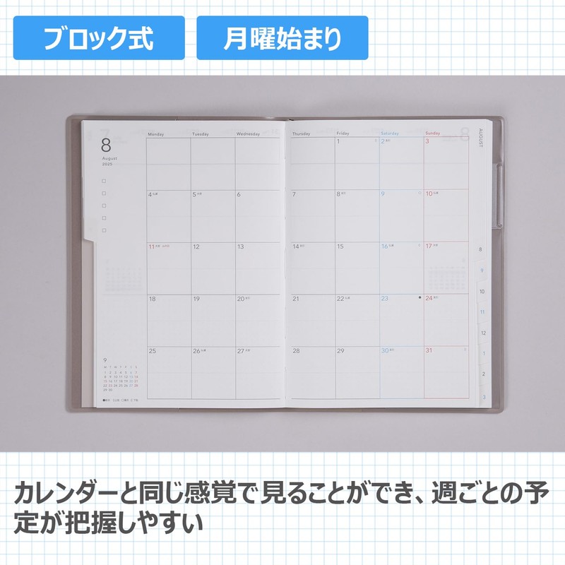 - Product Details 1: Size: Width 5.3 x Height 7.4 inches (13.4 x 18.9 cm); Monthly pages: Block type; Weekly pages: Vertical type; Starting on Monday; Posting period: Monthly pages: March 1, 2025 - April 30, 2026