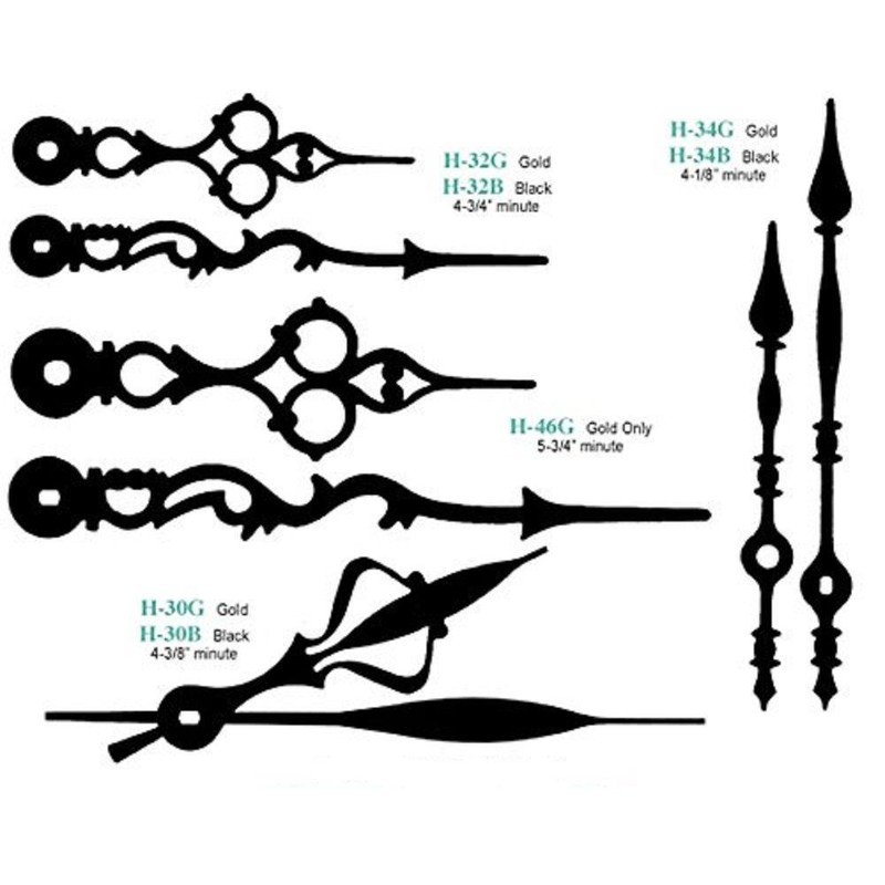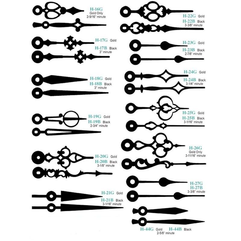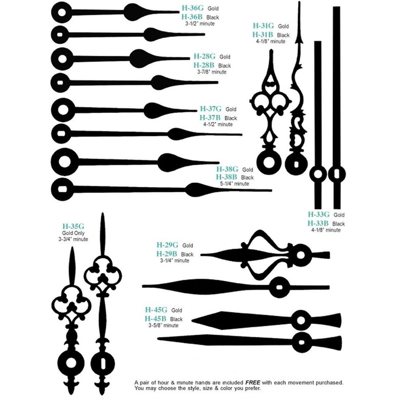 To request the hands and the shaft length, purchase the item first. After the payment is complete, send a message to the seller asking for the hands and shaft size that you need. To contact the seller, click on Your Account, then click on Your Orders, find the clock kit in the list and blue name where it says sold by. Now click on the Ask a Question button towards the top and follow the prompts to complete the customization request. The hand choices are shown in the photos in the upper left. The part numbers that end in a B are for black hands, the ones that end with a G are for gold hands.