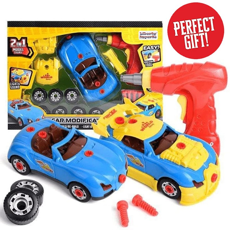 - CUSTOMIZED CAR: This 2-in-1 DIY build a car toy playset allows your child to build and customize their very own race car. With 30 pieces, including car parts, modification parts, 8 tires, drill, drill bit and screws, the possibilities are endless.