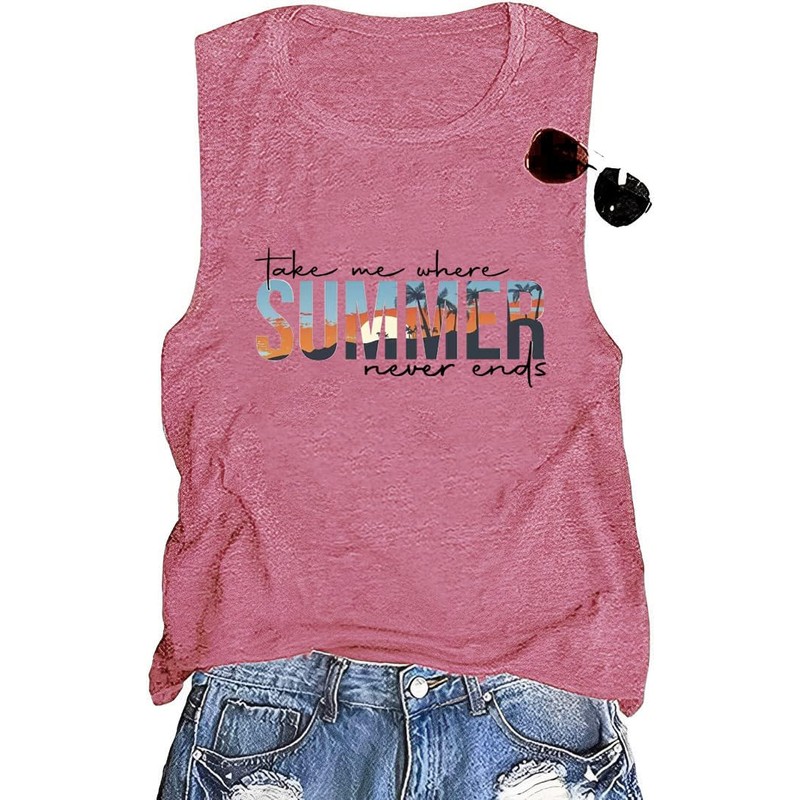 Take Me Where Summer Never Ends Letter Printed Tanks Cute Summer Sleeveless Workout Tshirts Fun Hawaiian Adventure Trips Soft Cotton Casual Top, Red Large