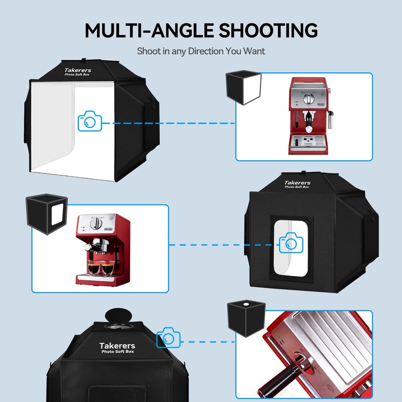 • Multi-angle Shooting Design and Portable Design: Takerers 16”x16” shooting tent is very easy to fold and set up just in seconds with velcro design. And it has 3 openings that allow you to take photos at 3 different shooting angles. As the photo box is preinstalled with 3 panels on each side, you can get sufficient light from any angle you want to get perfect photos or videos. Please kindly note that you need to remove the top diffusion cloth when you shoot from the top window.