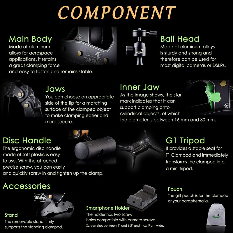 - [Ergonomic Design]: An ergonomic design disc handle made of soft plastic is easy to use, with the attached precise screw, you can easily and quickly screw in and tighten up the clamp and with a precise adjustment. Then its also Range of dedicated accessories available: T-S01 detachable standing base, smartphone holder and gift pouch.