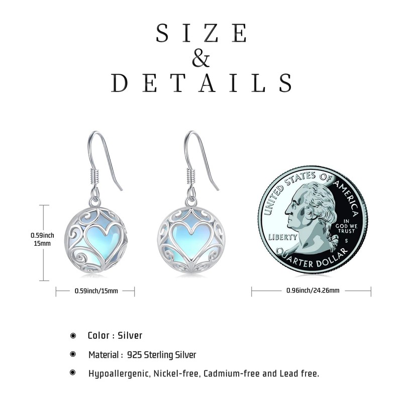 • Moonstone Earrings: These are heart drop moonstone earrings for women. The silver bars are curled and wrapped around the moonstone, and a heart shape is hollowed out in the middle, allowing you to better appreciate the luster of the moonstone.