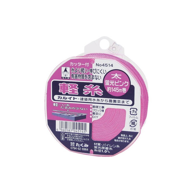 Even though it is thick it is light, it can be used to remove the peans. [Uses] Construction water thread. [Functions and Features] Made with the lightest thread of the fibers. Thick water thread that looks good Water thread that does not contain harmful substances (pollution free). Comes with thread stopper, safety design cutter. Specifications: Color: Pink. Thread thickness: 0.04 inch (1.0 mm). Length: 49.2 ft (145 m) Reel with cutter Product Size (W x H x D): 3.5 x 4.1 x 1.7 inches (90 x 105 x 42 mm); Weight: 3.3 oz (105 g); Product Code: 4960587045145; JAN Code: 496058704514