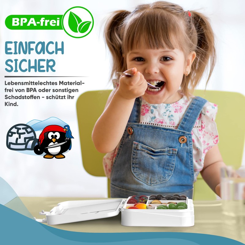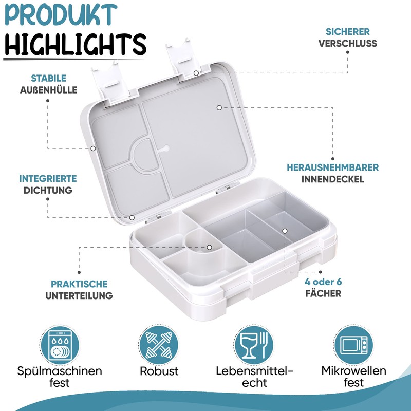 - ✔️𝑺𝑰𝑪𝑯𝑬𝑹 & 𝑭𝑳𝑬𝑿𝑰𝑩𝑬𝑳 - Unsere stabile Kinder Brotdose besitzt 4 abgeschlossene Fächer [flexibel auf 6 erweiterbar] und garantiert, dass der Inhalt auch nach Stunden noch appetitlich und frisch ist. Zusätzliche Dichtungen im Deckel verhindern ein Auslaufen des Inhalts (gilt nicht für Flüssigkeiten).