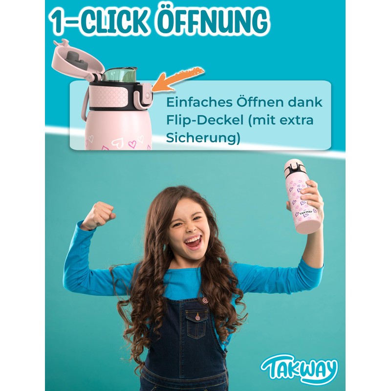 TAKWAY Children's Stainless Steel Drinking Bottle, 550 ml, Leak-Proof, Insulated and Suitable for Carbonated Drinks, Bottle for School, Sports (Heart)