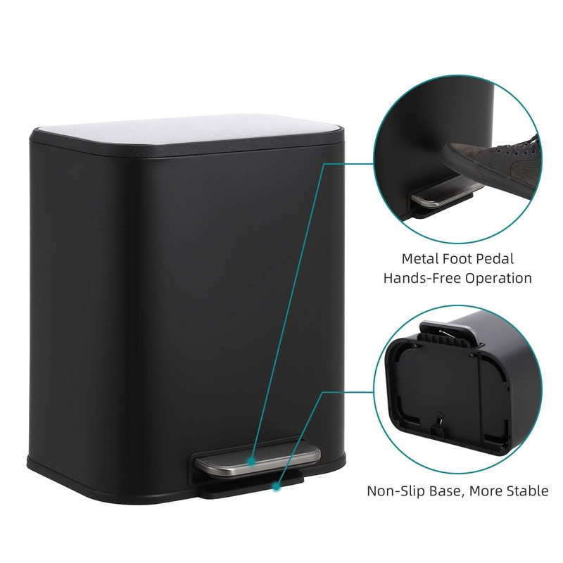 - Matte Black Finish: Crafted from robust stainless steel, featuring a stainless steel lid and foot pedal and a matte black powder-coated body, this trash can boasts a fingerprint-resistant and scratch-proof exterior that is effortless to clean and maintain