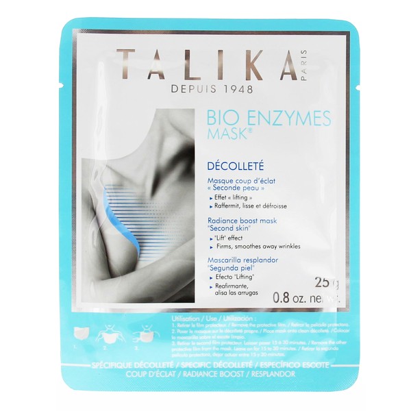 Talika Bio Enzymes Mask Decollete 25 gr is a mask to moisturize and eliminate wrinkles from the décolleté. With biocellulose, hyaluronic acid, vitamin B3 and a complex of 16 plants.