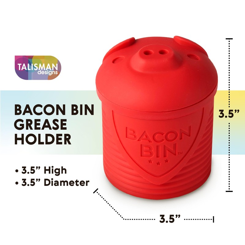 - BACON BIN SILICONE GREASE CONTAINER: Talisman Designs charming Bacon Bin Grease Holder is a fun way to safely strain, cool, save, or dispose of used bacon grease on the countertop or store in the refrigerator.