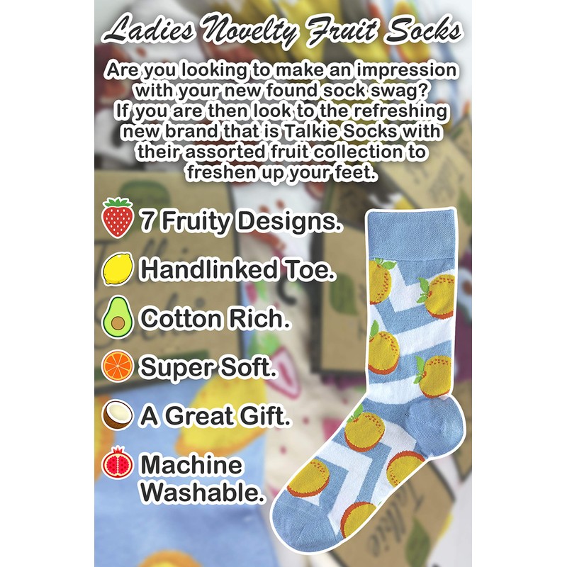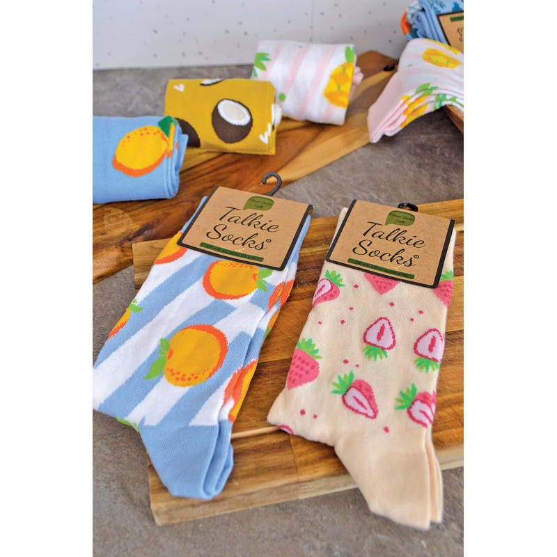 - TALKIE SOCKS - Are you looking to make an impression with your new found sock swag? If you are then look to the refreshing new brand that is Talkie Socks with their assorted fruit collection to freshen up your feet.