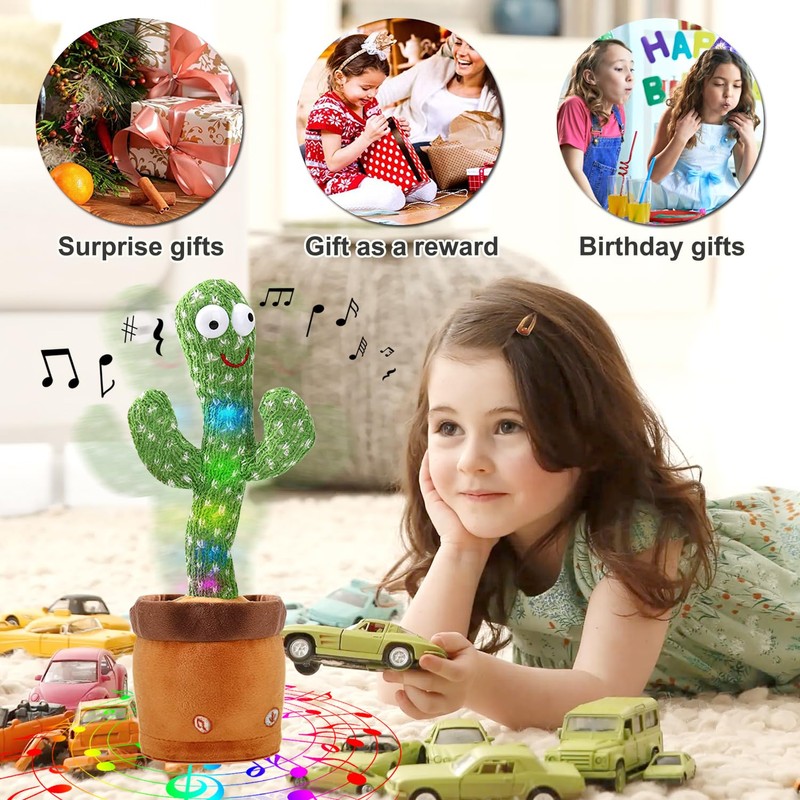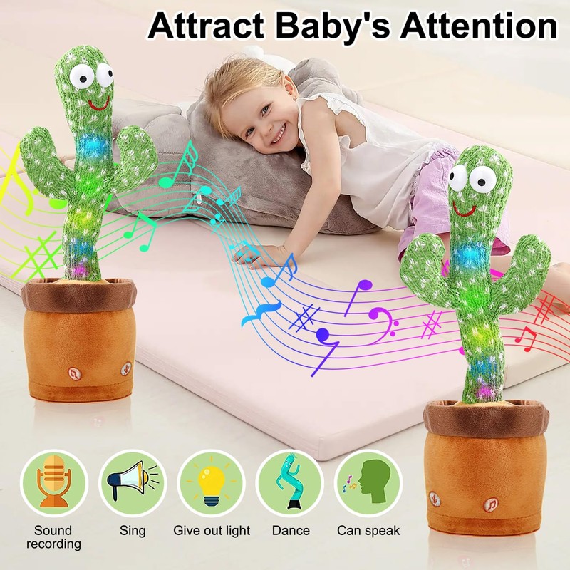 - 🌵Perfect Gift: Perfect gift for your kids or friends. This cactus baby toy will definitely make people who receive it laugh! It can record what you say and keep playing. Talking Cactus Plush Toys, Toys for Kids 3 Year and up, It can slso as a room decoration. Cheerful music and dancing are very suitable for creating a pleasant atmosphere and for hosting parties. Gifts for girls and boys. It is also a nice adults stress relief toy and educational toy for kids.