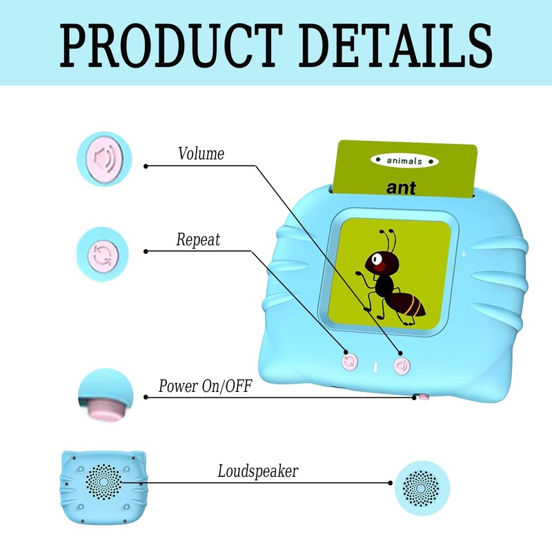 - PORTABLE AND EASY TO OPERATE-Design with small size,easy to carry.Turn on the switch,put the card into the card slot and the card reader will read the words.The repeat reading function helps kids remember words better and young babies can study independently