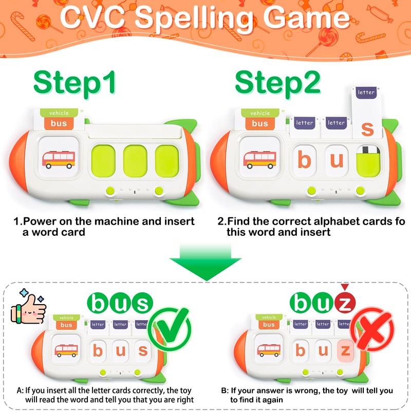 - Interactive Learning: Compared with traditional CVC matching letter games, our autism sensory toys provide a more interactive and fun learning experience. When insert a card, the phonics learning toy checks whether the spelling is correct or not, assisting kids in finding the right letters. This helps improve children's cognitive skills and spelling ability