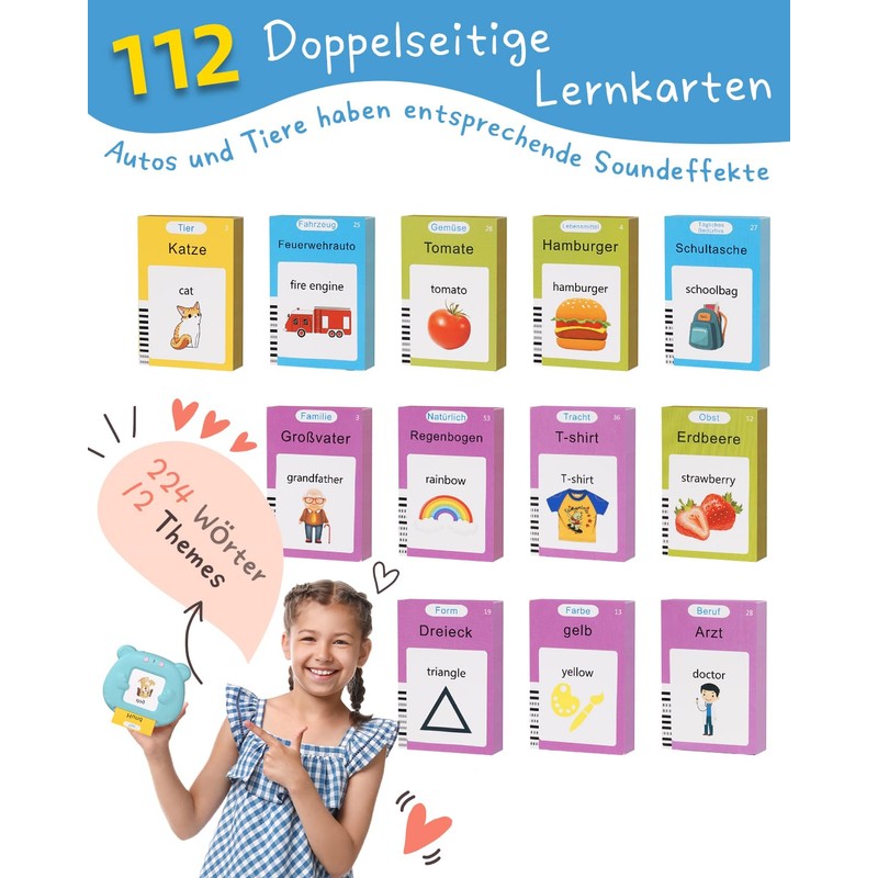 - 🌟 DOUBLE SIDED FLASH CARDS - Learn with 112 cards and 224 words from 12 subject areas! Children of different ages are suitable for different learning topics: children from 12 to 18 months learn basics such as colours, shapes and animals; children from 1 to 2 years are engaged in everyday topics such as fruit, food and clothing; children over 2 years explore more complex topics such as everyday objects, occupations and nature. Our early education system supports switching between German and English. By long pressing the tone and repeat button for two seconds, you can switch the language, ideal for preparing for voice promotion from 2 years.