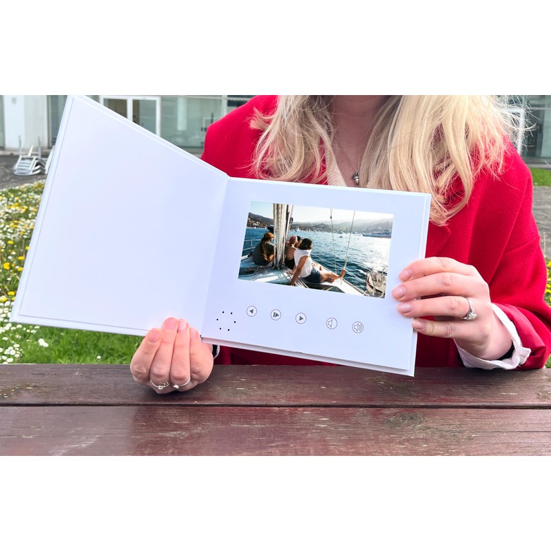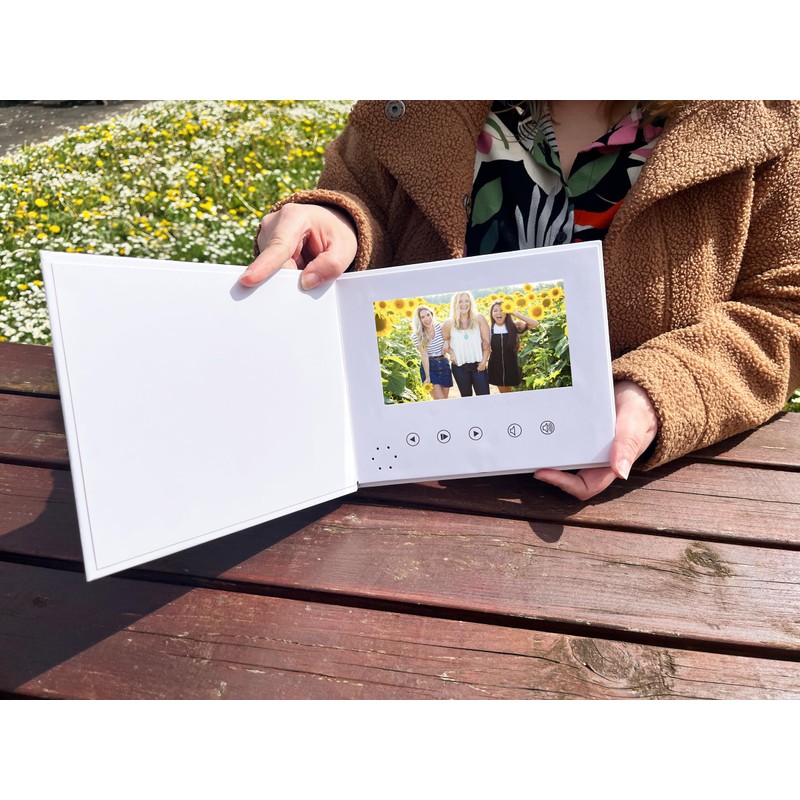 Loading your own videos up to 4GB (up to 4 hours of video files) with our video book is an original and unique way to share your videos, with each video book featuring a play/pause button, forward/back buttons and volume. It is completely re-recordable, so you change the content if you wish.