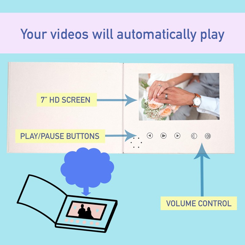 - 7" HD SCREEN – Our motion video book offers a high resolution 7” HD screen and is compatible with popular file formats like MP4, MOV, and AVI. For best performance, we recommend formatting your graphics to 1024x600 pixels.