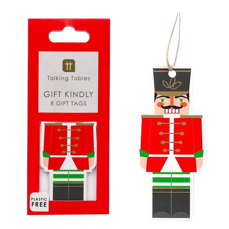 - ABOUT THE PRODUCT: The Nutcracker is an enduringly popular Christmas character and these shaped gift tags add fun to any present. Coordinating with our Nutcracker collection of crackers, napkins and more, they are part of our new Gift Kindly range of sustainable gift wrapping and accessories. Made from paper from sustainably managed forests, they are plastic free and recyclable and come in a pack of eight.