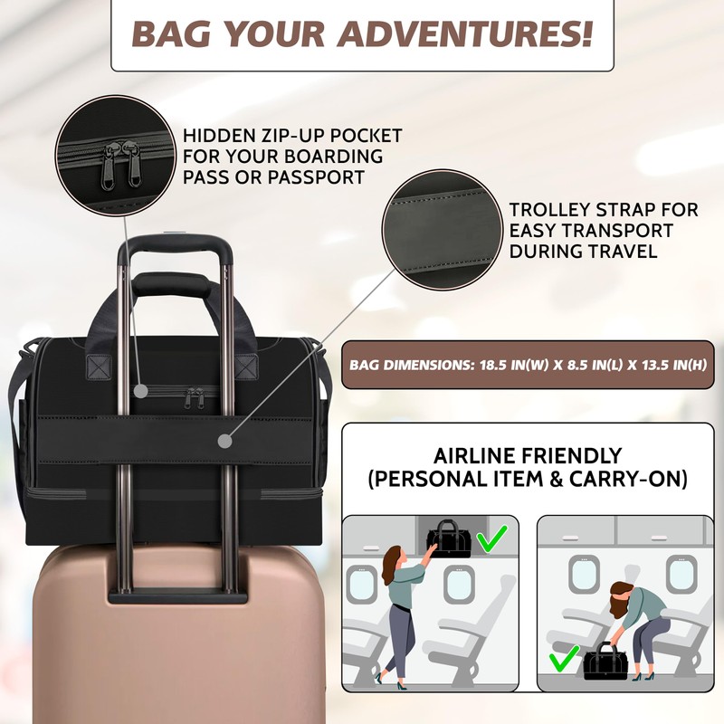 - FITNESS & TRAVEL READY: Seamlessly transition between your workout and travel routines. A dedicated yoga mat holder, a convenient trolley strap, and an airline-friendly design ensure you're always prepared for your next adventure, whether it's a gym session or a globetrotting escapade with this small travel bag.