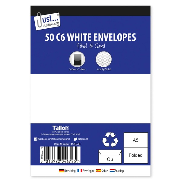 Tallon Just Stationery C6 Peel & Seal Envelopes - White (Pack of 50)