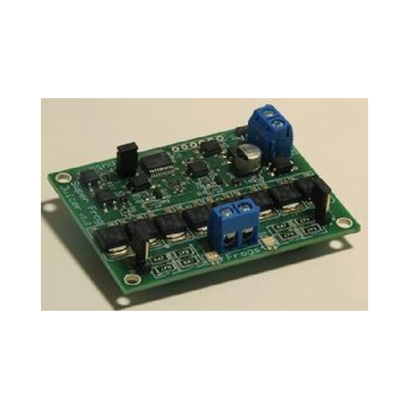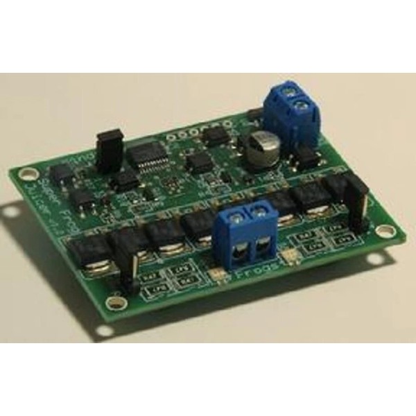 This is the same board as the Dual Frog Juicer but confugured to work as a circuit breaker.  When there is a short it will cut off both rails at once.  This solves some problems where only one rail is cut off and wheels bridge to another active rail.  Also the auto-reverse has been disabled - this gets around the issue of having an auto-reversing section and frog juicers within the district powered by the circuit breaker. Cut off current limit can be set to either 2 Amps or 4 Amps with jumpers. LEDs have been changed to indicate green for normal operation and red for a short.  You can also add a remote LED to indicate a short. It has 33 Amp transistors so it can be used with 10 Amp boosters.  Setup is simple, connect the input to the DCC track bus, and connect the output wires to the district to be protected.