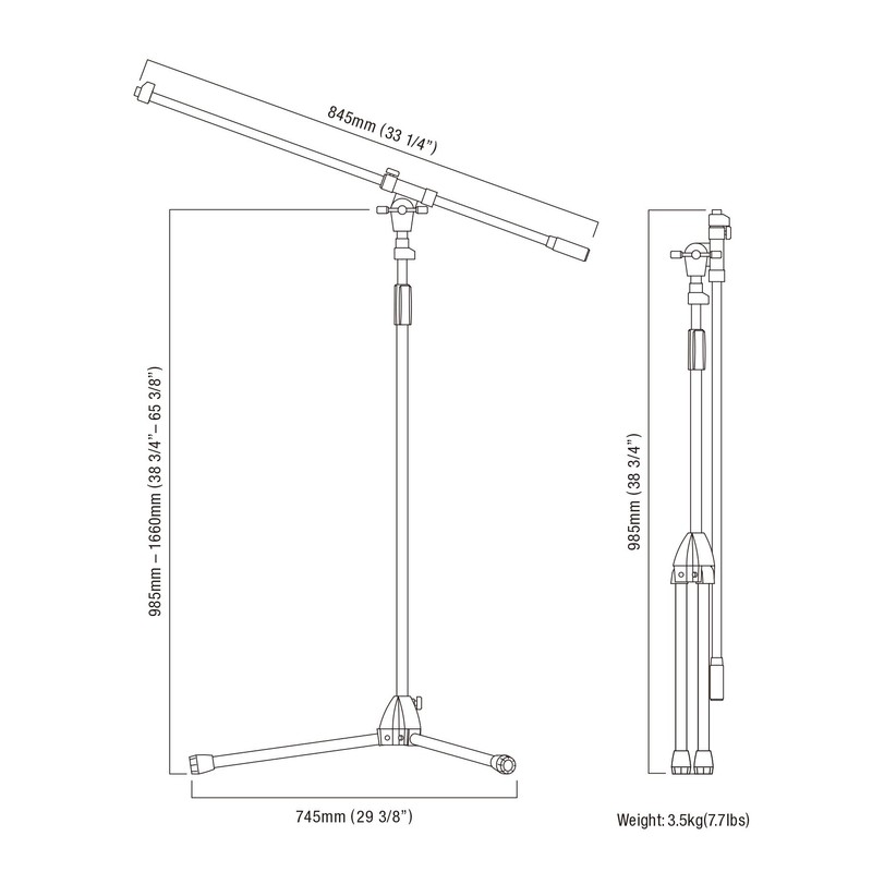 - Height : 38 3/4" to 65 3/8", Boom : 33 1/4"