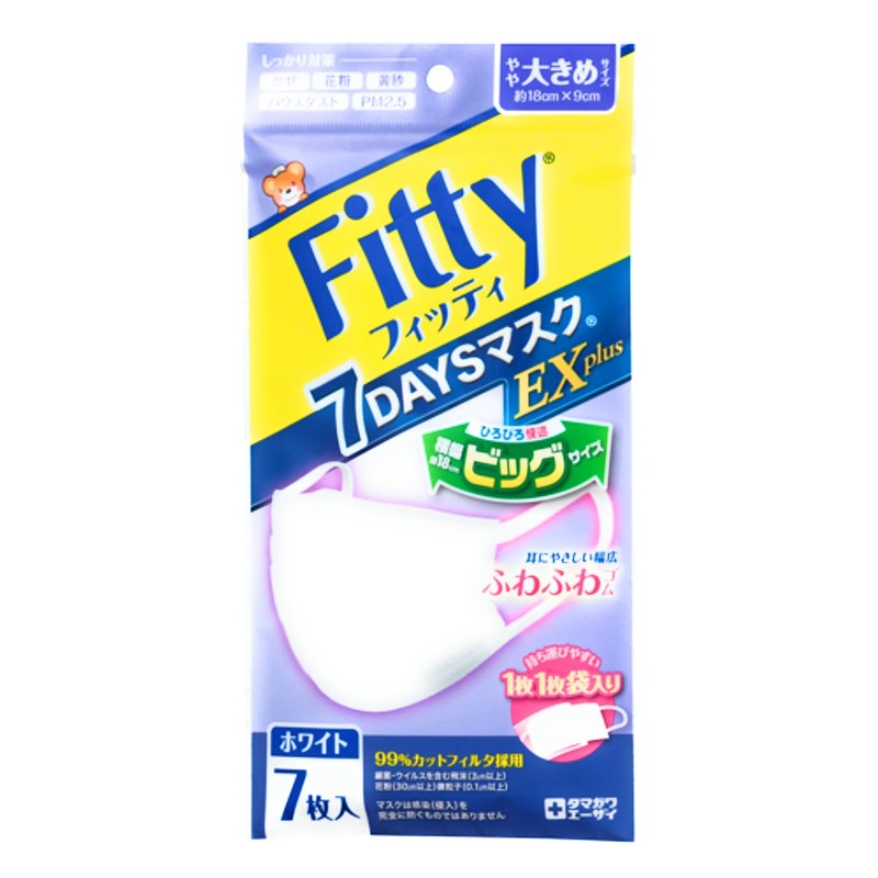 - Fitty 7-Days Mask EX White Slightly Larger 7-Piece Pack has a 3-layer construction that protects against pollen and viruses. Non-woven triple layer filter protects pollen and dust The nose fitter and mask have been processed on both sides to fit perfectly on your face. The three-dimensional pleating process prevents pressure on the nose and mouth and eliminates unpleasant breathing. The ear pads are made of a wide soft rubber that is gentle on the ears. Individually wrapped for easy portability