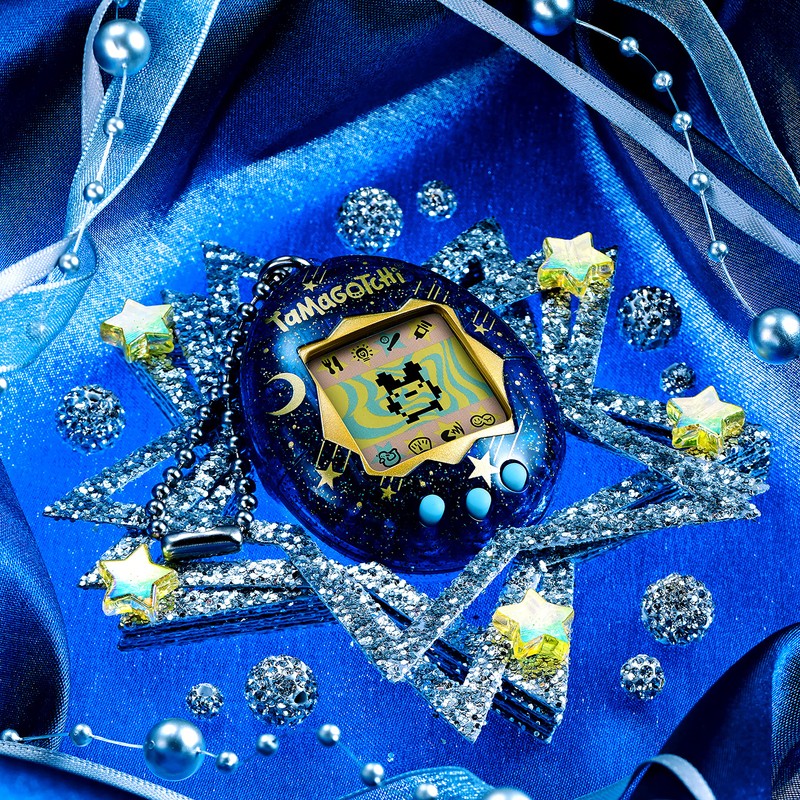 - A star shower shell with gold 'Tamagotchi' and frame, light blue buttons and generation 2 programming and characters