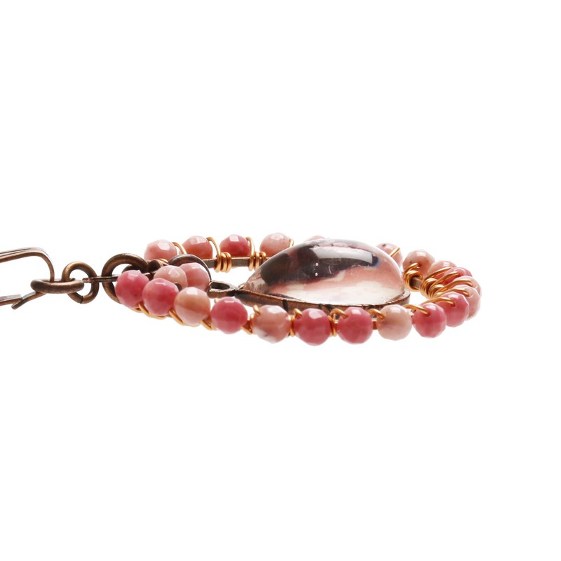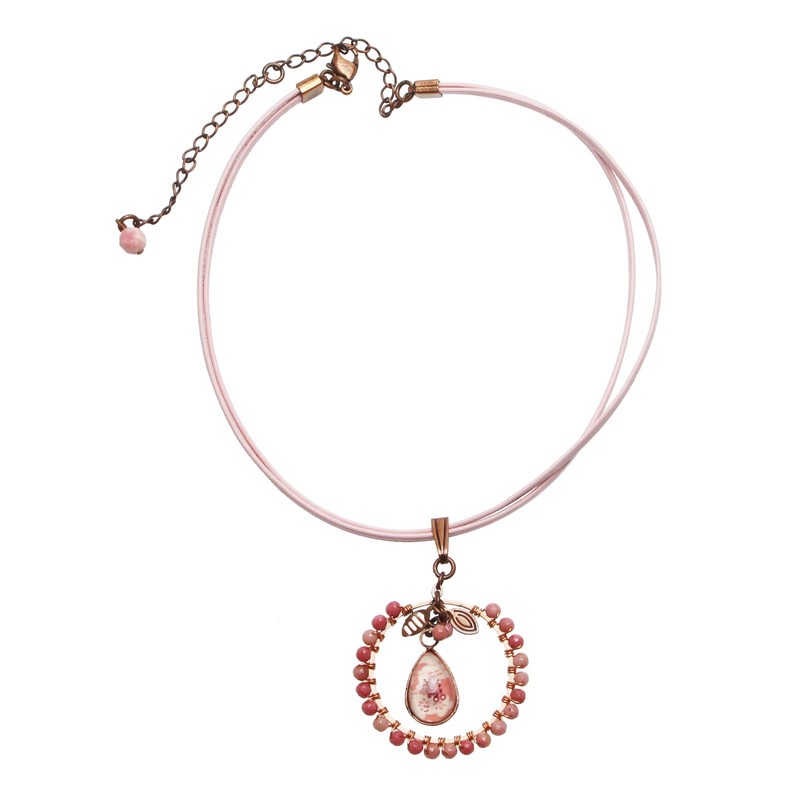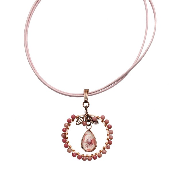 This is a fashionable 2-row choker made with resin parts from the Fukuumi Series (Pink). Cute design with rhodonite wrapped hoop and pink leather cord. Add a gorgeous accent to your neck. This is a great accessory as a gift. Resin and metal parts are handmade. Lucky Plum Series (Pink): This series is named from the traditional Kaga Japanese confectionery name, "Fukuumi" (Fukuumi). Cute hand-painted plum blooms in resin It also floats small grape beads and pink sand. The depth spreads into a transparent resin. It has a soft and gentle atmosphere. The combination of garnet, rhodonite and freshwater pearls is exquisite.