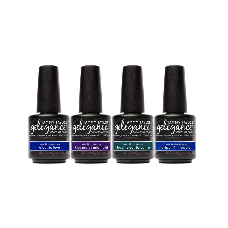 - This Bundle includes 4 Gelegance Gel Polishes & 4 Soulmate Nail Lacquer's: Electric Love is a deep electric blue. Kiss Me At Midnight is an ultra violet. Best Is Yet To Come is a creamy teal. Drippin' In Jewels is a sapphire blue with holographic glitter.