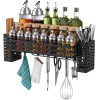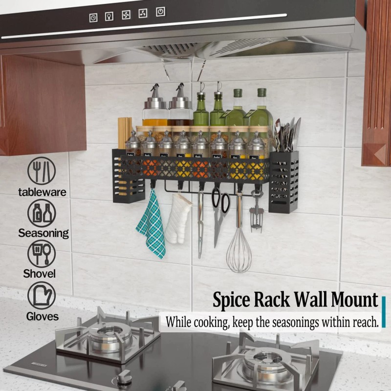 Tamomic Hanging Spice Rack Wall Mount, Over Stove Spice Organizer Shelf with Wall Hanging Utensil Holder 6 Hooks for Kitchen, Black