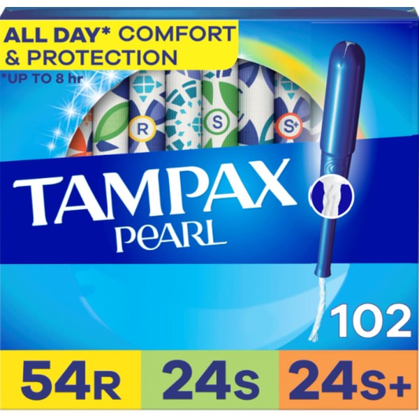 Tampax Pearl Tampons for Women Multipack, Regular/Super/Super Plus Absorbency, With Leakguard Braid, Unscented, 102 Count (3 Packs of 34)