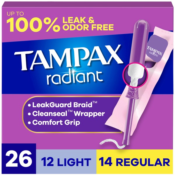 Tampax Radiant Tampons Multipack, with LeakGuard Braid, Light/Regular Absorbency, Unscented, 26 Count