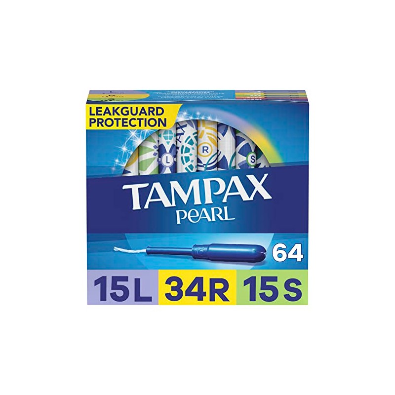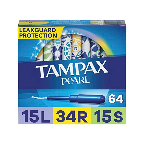 Tampax Tampax Pearl Tampons Multipack, with LeakGuard Braid, Light/Regular/Super Absorbency, Up to 100% Leak and Odor Free Protection, Unscented, 64 Count