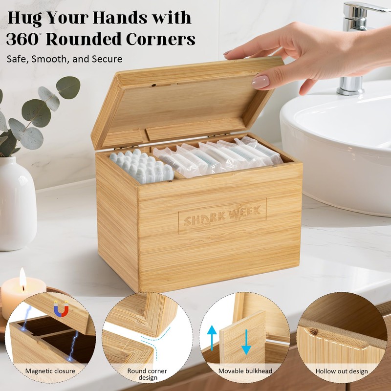Tampon Holder with Lid,Bamboo Feminine Product Organizer for Bathroom, Shark Week Storage Box for Women and Girls,Sanitary Napkins Disposable Face Towel Cotton Swabs Balls Floss Picks Container