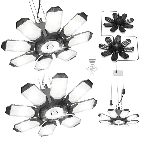 TANBABY 2 Pack Motion Sensor Garage Light, Deformable Garage Lights Ceiling LED Plug in Cord, Plug in Shop Lights with 8+1 Panels Bulb for Basement