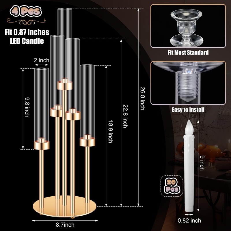 Tandefio 4 Set 5 Arm Gold Candelabra Table Centerpieces and LED Candles 26.8'' Tall Wedding Floor Candle Holder Acrylic Candlestick Removable Lampshade Fit 0.8 Candle Christmas Thanksgiving Party