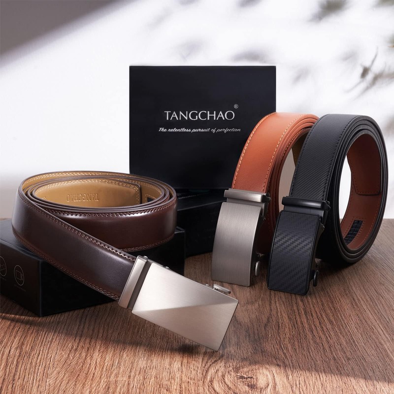 TANGCHAO Men's Belt, Leather Belt Ratchet Automatic Buckle for Men Business Suit Jeans, 35 mm Belt, Adjustable Size, Brown 10