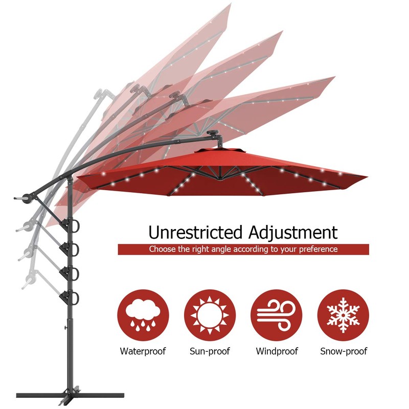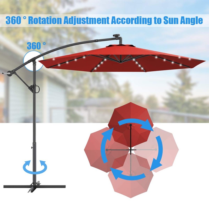 Tangkula 10 FT Patio Offset Umbrella with 360 Degree Rotation, Solar Powered LED Umbrella with Crank Handle & Cross Base, Outdoor Market Umbrella with Aluminum Pole (Burgundy)